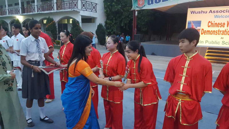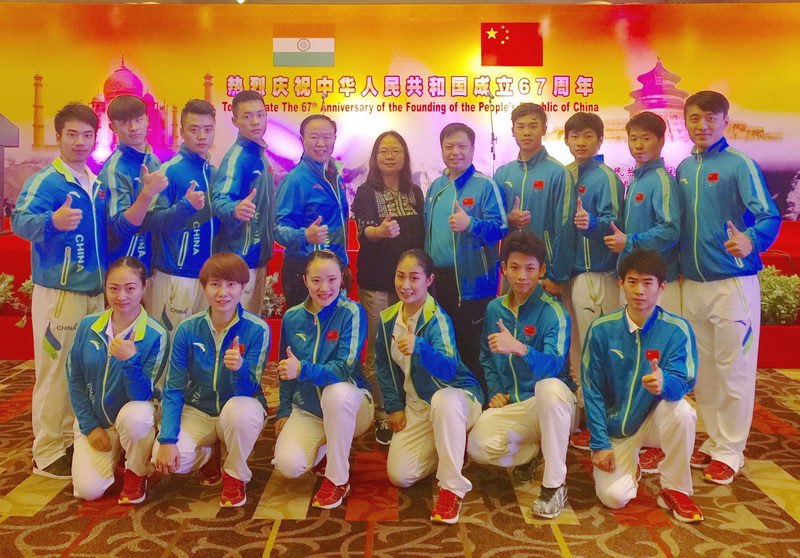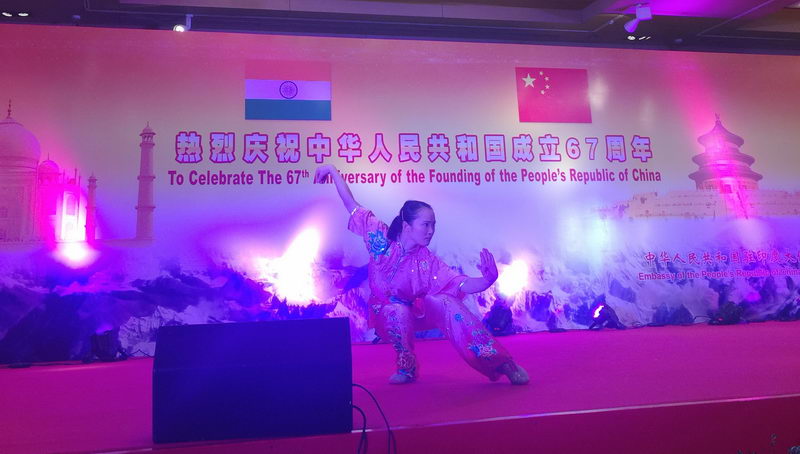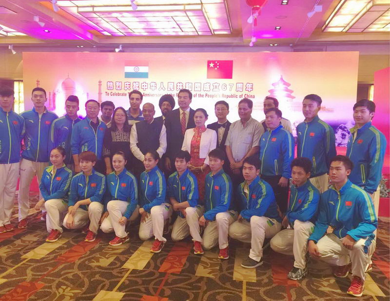 第二天,队伍乘坐大巴回到德里,参加驻印度使馆举办的国庆招待会。表演场地布置得张灯结彩、喜气洋洋。印度青年事务与体育部国务部长、印议会、外交部、商务部、文化人士、媒体人士、外国及国际组织驻印使节等550余人出席了招待会。表演团表演了7个节目,太极拳的行云流水、醉拳的潇洒幽默、长拳的舒展大方、咏春拳的刚柔并济、南拳的威猛迅疾,赢得了来宾阵阵掌声和喝彩。表演结束后,驻印度大使罗照辉和夫人、驻印度公使刘劲松和印度青体部部长与队伍合影留念。大使对运动员们夸赞说:"你们表演得很好啊!"  高德温学校表演前
