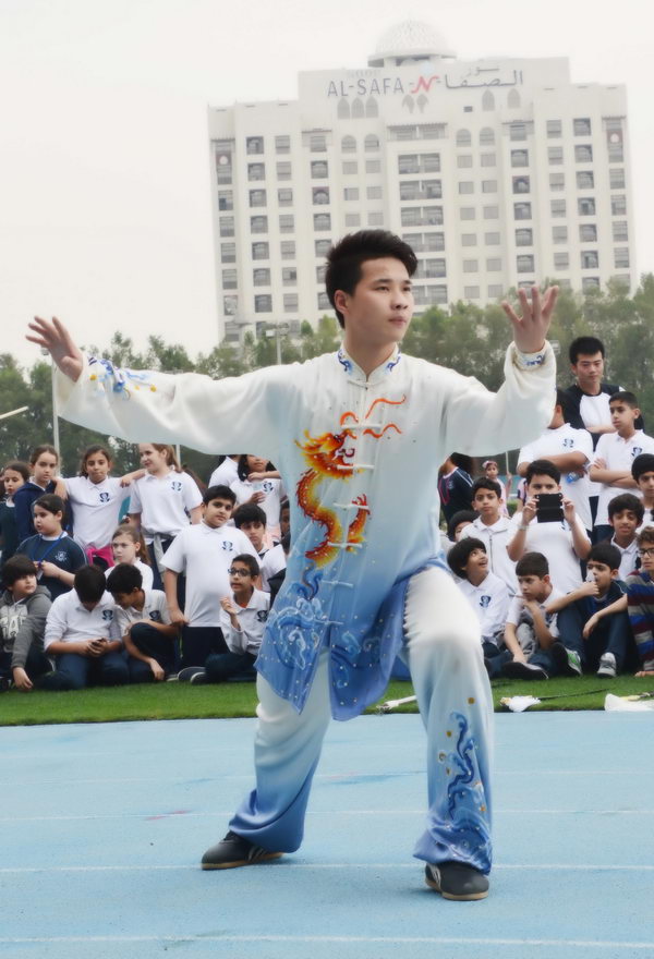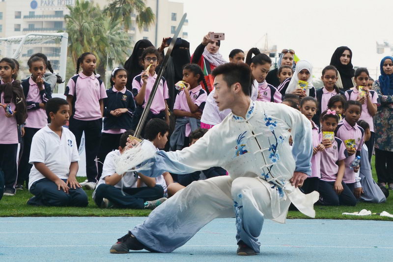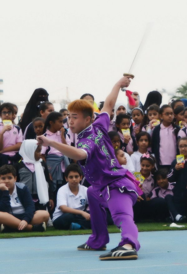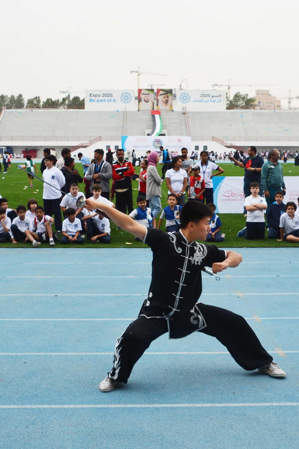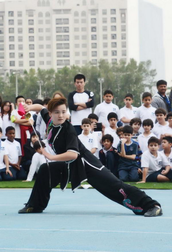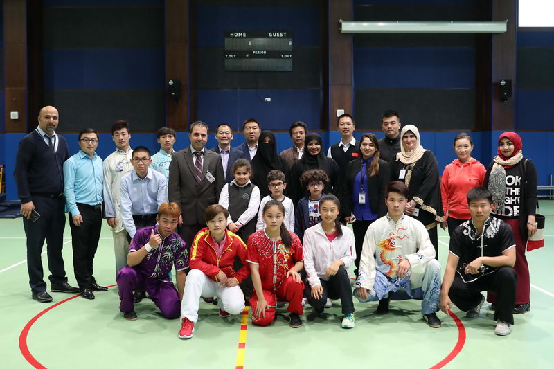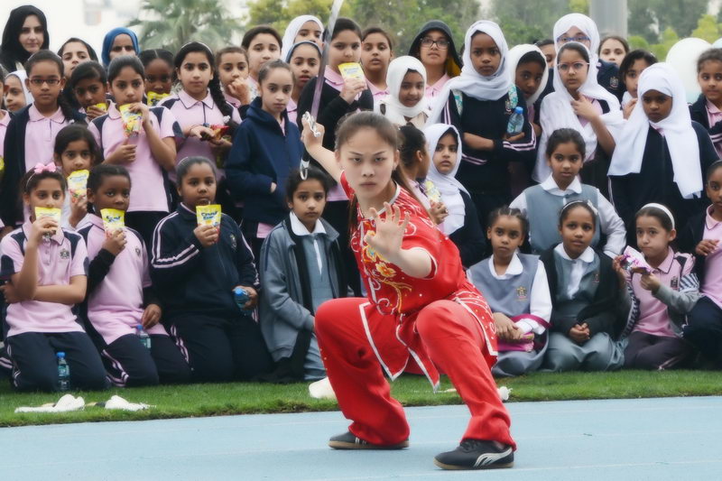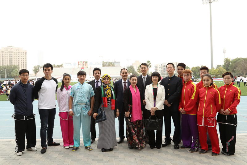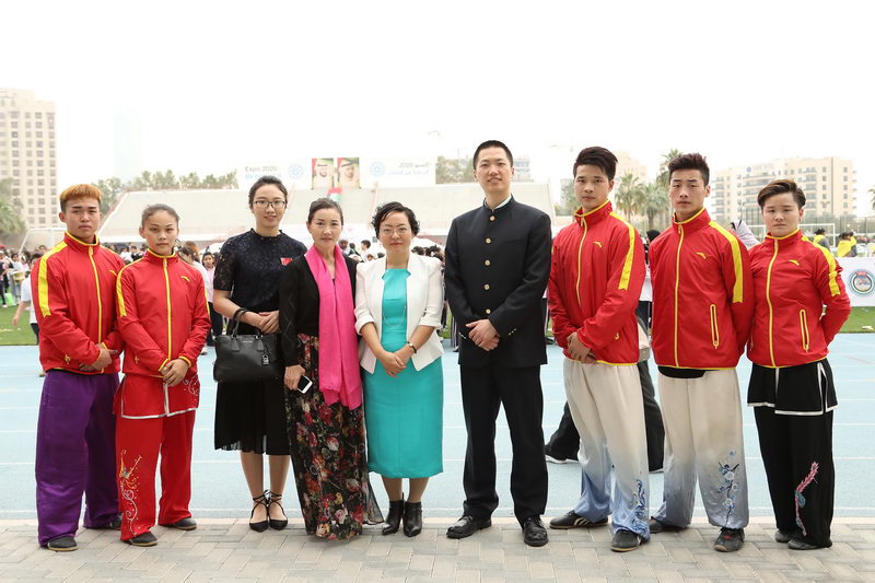 2017年2月15日至19日,中国武术代表团一行六人(郑楠、颜志威、李宝佳、蒋誉华、崔广霞、黄蓉)赴阿联酋参加了全民健身日武术表演与教学活动。所到之处,受到了当地人民和华人华侨的热烈欢迎,表演与教学取得圆满成功,引起了轰动效应。 表演震撼全场 2017年2月16日,阿联酋全民健身日活动在迪拜警官俱乐部体育场隆重举行。中国武术协会从武汉体院抽调了5名优秀运动员组成武术代表团,与迪拜精武会的教练员一道参加了此次活动,并在最后一个压轴出场。代表团展示了集体拳、集体剑、太极拳、刀术、棍术、枪术、南拳、南刀、披挂拳、朴刀、单鞭、双钩等武术项目,为阿联酋人民献上了一场精彩绝伦的武术视觉盛宴。现场观众看得目不转睛、如痴如醉,随后爆发出热烈的掌声,表演收到了轰动效果。同时,经过迪拜精武会培训的300名阿联酋小学生展示了他们所学的中国武术,得到了各方的一致好评和高度认可。 中国驻迪拜总领馆总领事李凌冰女士、副总领事王振山先生,办公室主任徐海风先生、秘书丁梦颖女士、巴林孔子学院院长吴雪颖女士、教员黄鑫女士、迪拜警察官员等嘉宾出席了本次活动,阿联酋川渝商会同乡会、阿联酋华侨华人妇女联合会的代表们也来到现场,为中国武术代表团和小朋友们加油助威,共享来自祖国的武术嘉年华。 互动广受欢迎 除阿联酋全民健身日活动的现场表演外,中国武术代表团还深入到内政部直属的公立阿联酋国家学校(Emirates national school)和沙迦美国国际学校(Sharjah American international school),与广大师生进行了武术互动和表演。表演震撼了在场的观众,孩子们叫好不断,纷纷模仿教练员的动作。随后,代表团成员和迪拜精武会的教练员一起辅导孩子们学习武术动作,现场氛围热烈,最终大家共同合影留念。精彩的表演和互动也打动了校方管理层,为下一步武术在阿联酋校园的全面铺开奠定了坚实的基础。 推广效果斐然 2014年,由许峰先生和丛小玲教授创立的迪拜精武会走进阿联酋,开始在这里推广武术。他们以中国穆斯林武术为切入点,求同存异,立即得到了阿联酋人民的认可和喜爱。在经费短缺的情况下,在热心华商的大力支持下,经过两年多的免费教学和艰苦努力,逐步将中国武术推广进入阿联酋的中小学,使武术成为促进阿联酋学生身心健康、锻炼意志品质的有效手段。自创立至今已累计培训学员逾万多人。在今后的日子里,精武会将积极促成阿联酋武术协会的成立,并希望通过武术来传递健康、和谐的生活方式,将武术文化传播到阿联酋的每一个角落,并在不久的将来,培养出阿联酋的第一个武术世界冠军。(文/郑楠 图/何广伟、郑楠)  代表团、精武会与总领馆李凌冰总领事、王振山副总领事合影