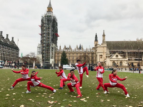 12月4日武术团全体由北京出访前往伦敦。12月5日全团在肯辛顿宫花园和特拉法加广场进行了公开展示活动,向公众宣传推广中国武术,引来当地民众驻足观看,并纷纷与我方运动员合影留念。运动员们克服了旅途劳顿、休息不足等不利因素,发扬了不怕苦、不怕累的精神,圆满地完成了展示任务,同时展现了中国武术运动员昂扬向上、朝气蓬勃的精神面貌和武术精、气、神的传统特色。