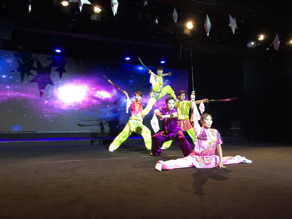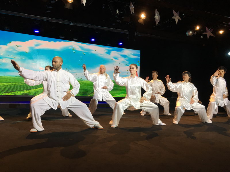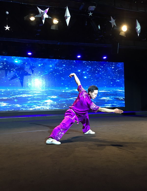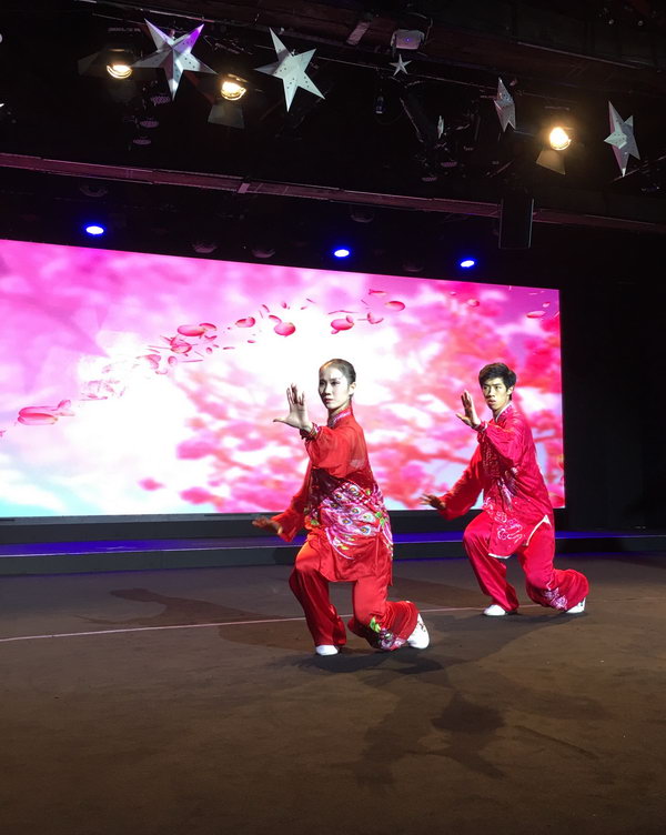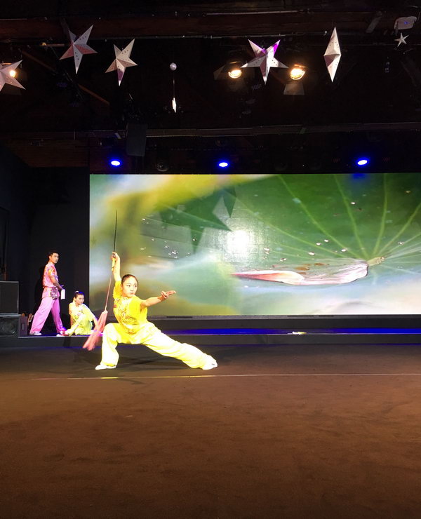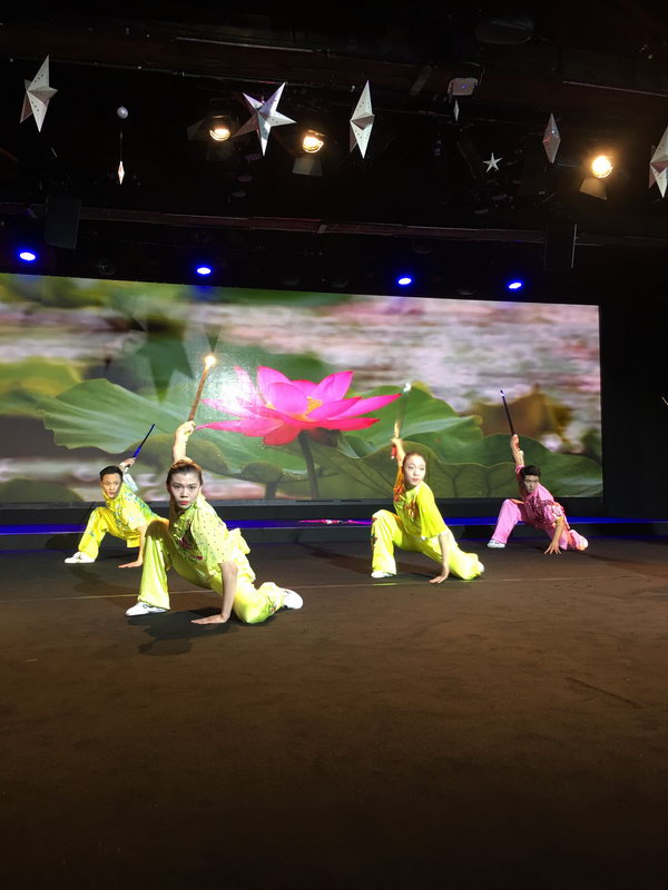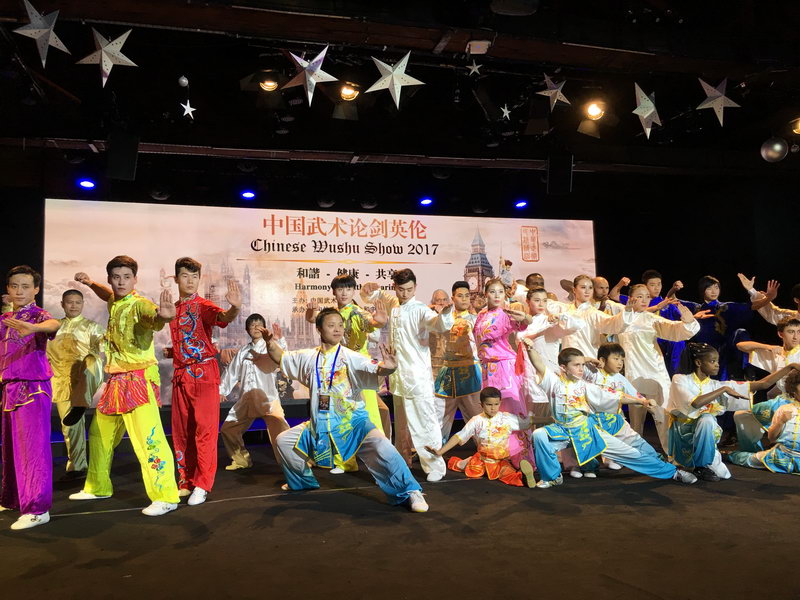 经过适应场地和排练后,"中英武术精英荟萃联合公演"于12月9日晚在伦敦金融城正式上演。我方15名武术冠军与英国当地武术馆校的运动员同台为在场观众奉献了一场内容丰富的武术表演。演出以"和谐、健康、共享"为主题,展示了竞技武术与传统武术的代表项目。伴随着舞台背景墙流动着的精美画面,在优美的音乐声中,运动员们表演了太极拳剑、八卦掌、螳螂拳、醉剑、器械对练等节目,精彩纷呈,观众的掌声、叫好声不绝于耳。观众们深深地陶醉在武术带来的美好享受中。演出结束后,在场观众争相与表演者合影留念,并对演出赞不绝口。英中体育交流协会、英中功夫协会代表、当地华人华侨、对华友好人士等出席并观看了表演。场面气氛十分热烈。演出结束后10多家媒体对代表团进行了现场采访。记者们踊跃提问,领队陈恩堂和运动员们现场解答了记者的问题。